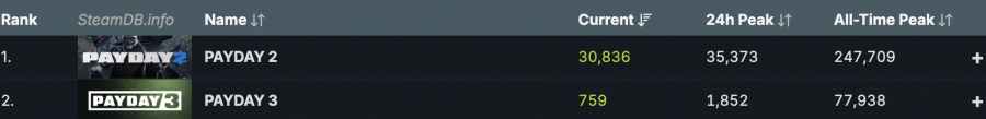 在遊戲推出接近兩年之後,目前《Payday 3》在 Steam 上的評價依然是褒貶不一、大多負評;玩家人數亦未如理想(下圖為本文刊登時在 SteamDB 截取的數據):