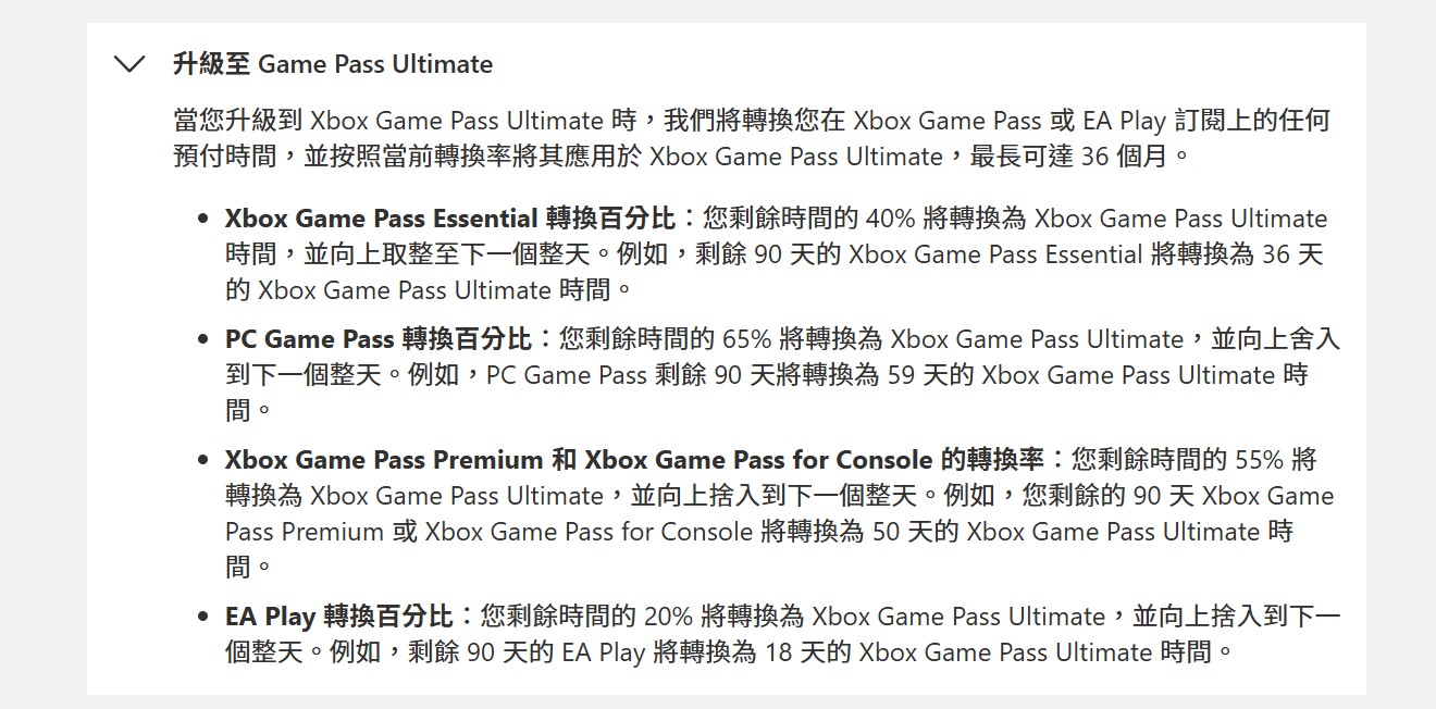 如果你已經有 Ultimate,那就能以 PC Game Pass 以大約 60% 的兌換率轉成 XGPU,大約是 6 個月變成 4 個月。在格價網站購買 PC Game Pass 3 個月是 $110 – $139,我們以最高價格 $139 來計算(微軟官網要 $100/月)。購買 6 個月的 PC Game Pass 一共 $278,兌換 4 個月的 XGPU 後是 $69.5,比起直接買 XGPU 更便宜,還有直接兌換的頁面 //www.xbox.com/zh-HK/redeem