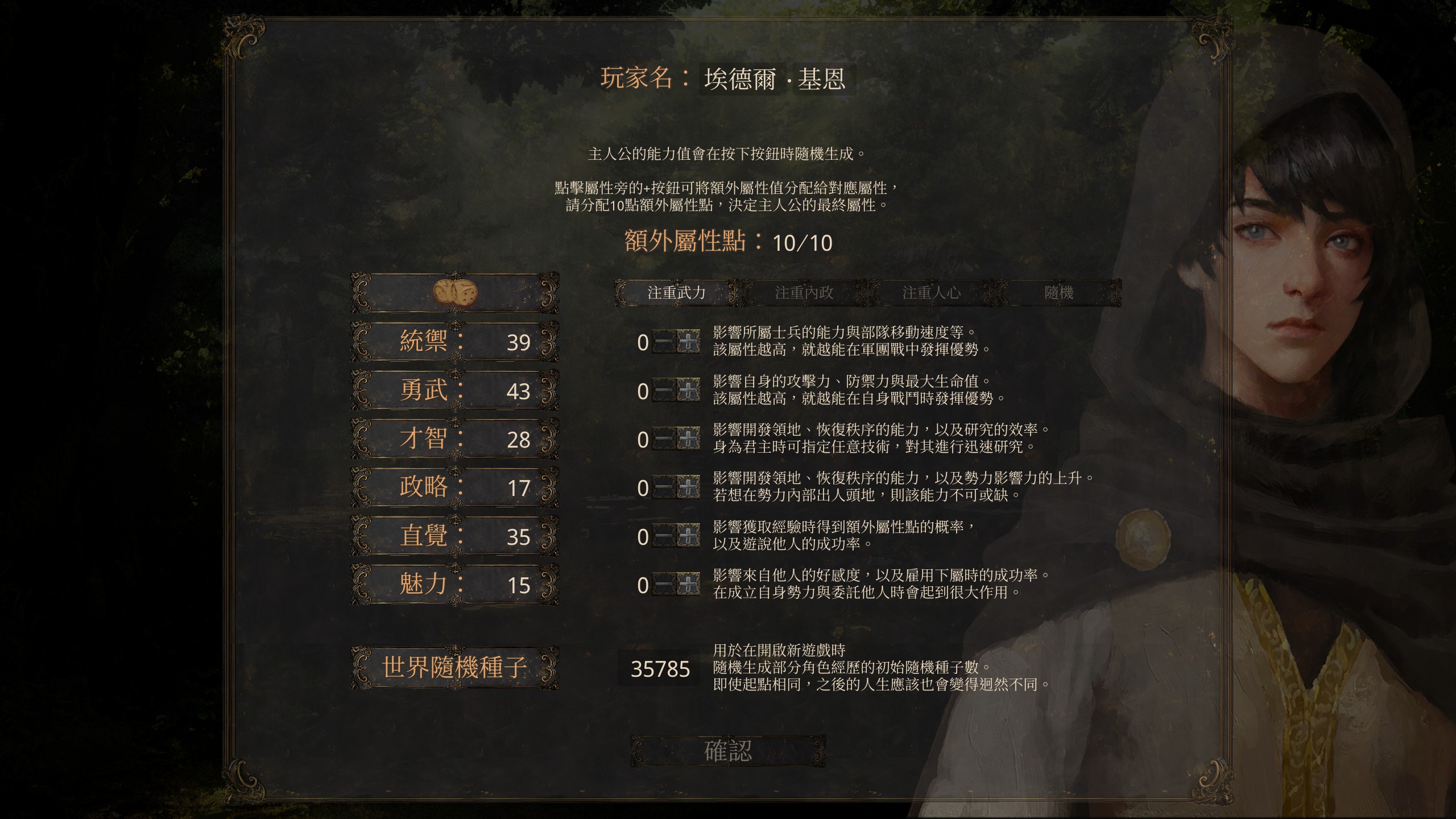 在正式開始前玩家要創角,共有六種屬性領導力、軍事力量、智力、政治、直覺和魅力,影響不同情況下優勢,例如軍事力量讓你有更強的個人戰鬥能力、魅力讓你在與 NPC 互動時更有優勢。遊戲的目標是在「歷史終結」的過程中生存,你能選擇什麼都不做,又或是努力獲得名聲和財富,逐步獲取權力左右世界。