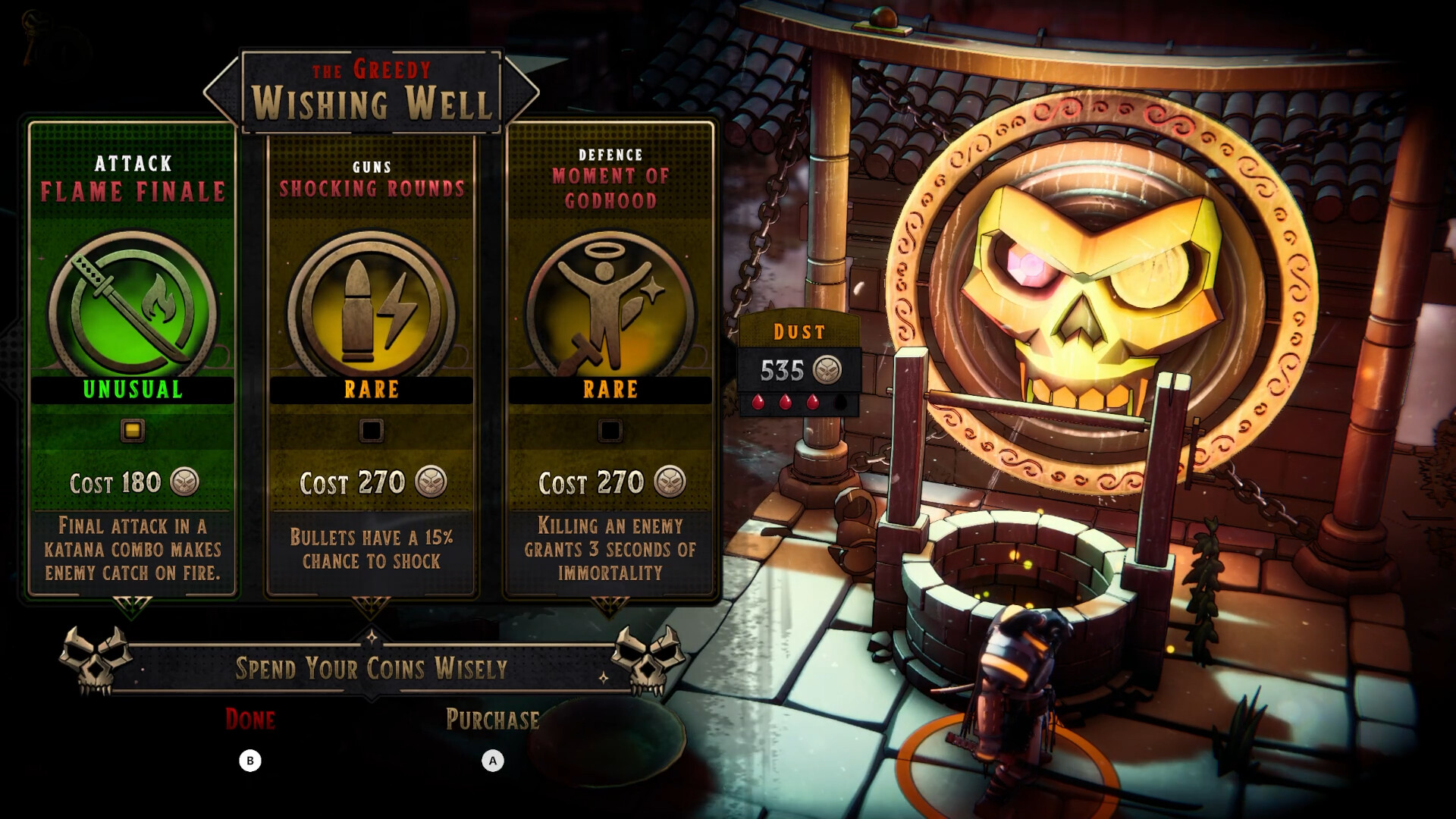 玩法上,本作以完美格擋及看破敵人攻擊為核心,再施以一連串斬擊及終結技。在這個之上你還能奪取敵人的武器「以彼之道,還施彼身」。至於 Roguelike 元素在本作則以每輪出現的技能及像賭博的詛咒(Debuff)出現,敵人的配置是不變的。