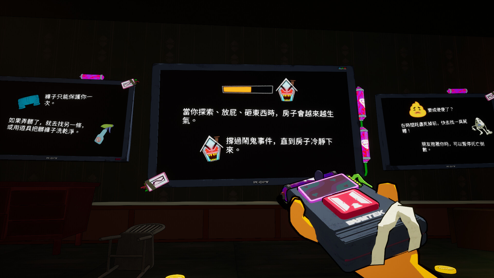 玩法是在隨機生成機關與結構的鬼屋中尋找廁所,一邊解謎、避開幽靈或開路等,而你必需要管理好自己的「腸道值」,受到恐懼和傷害會提升,能透過放屁來減低壓力,但如果放任不管,便會 GG。